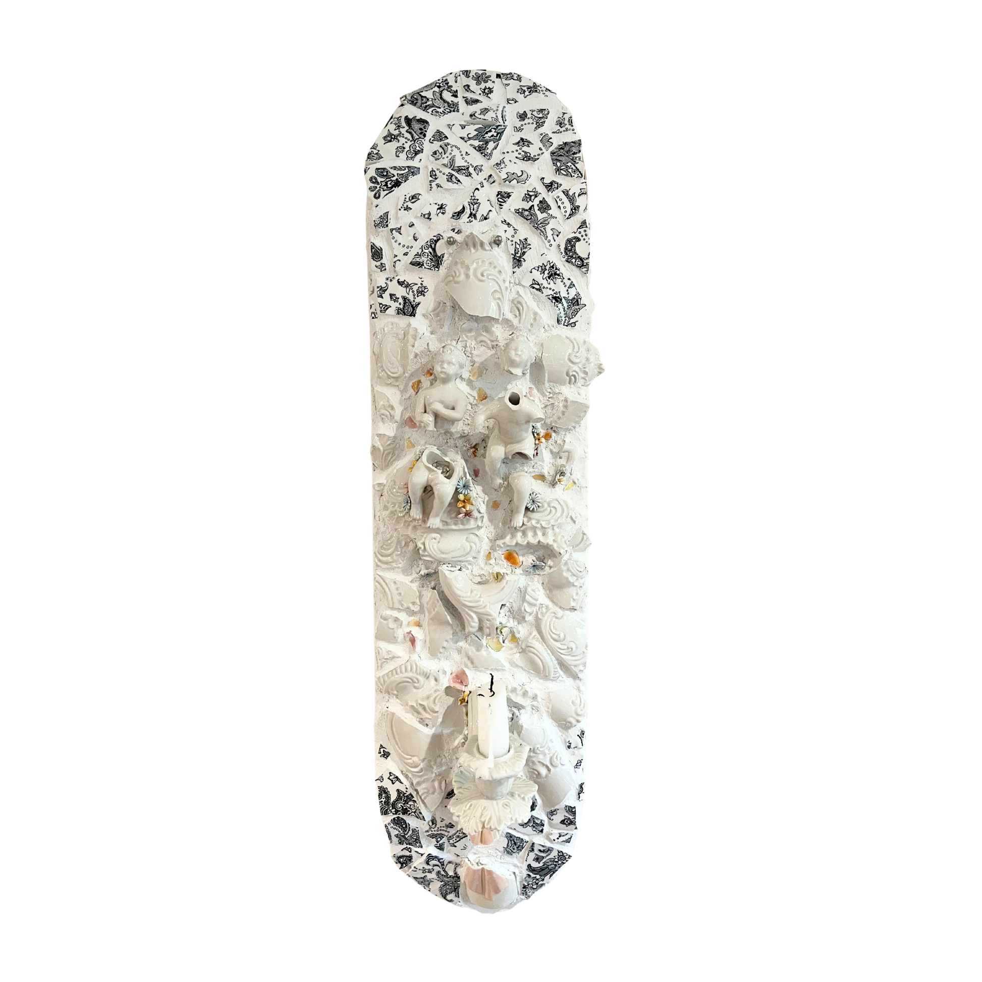 Broken porcelain vase with grout and pressed gold glitter on skateboard.