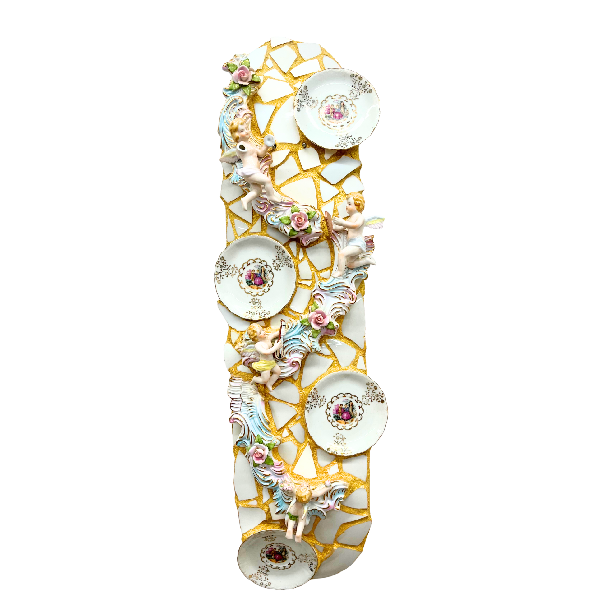 Broken china with grout and pressed gold glitter on skateboard.